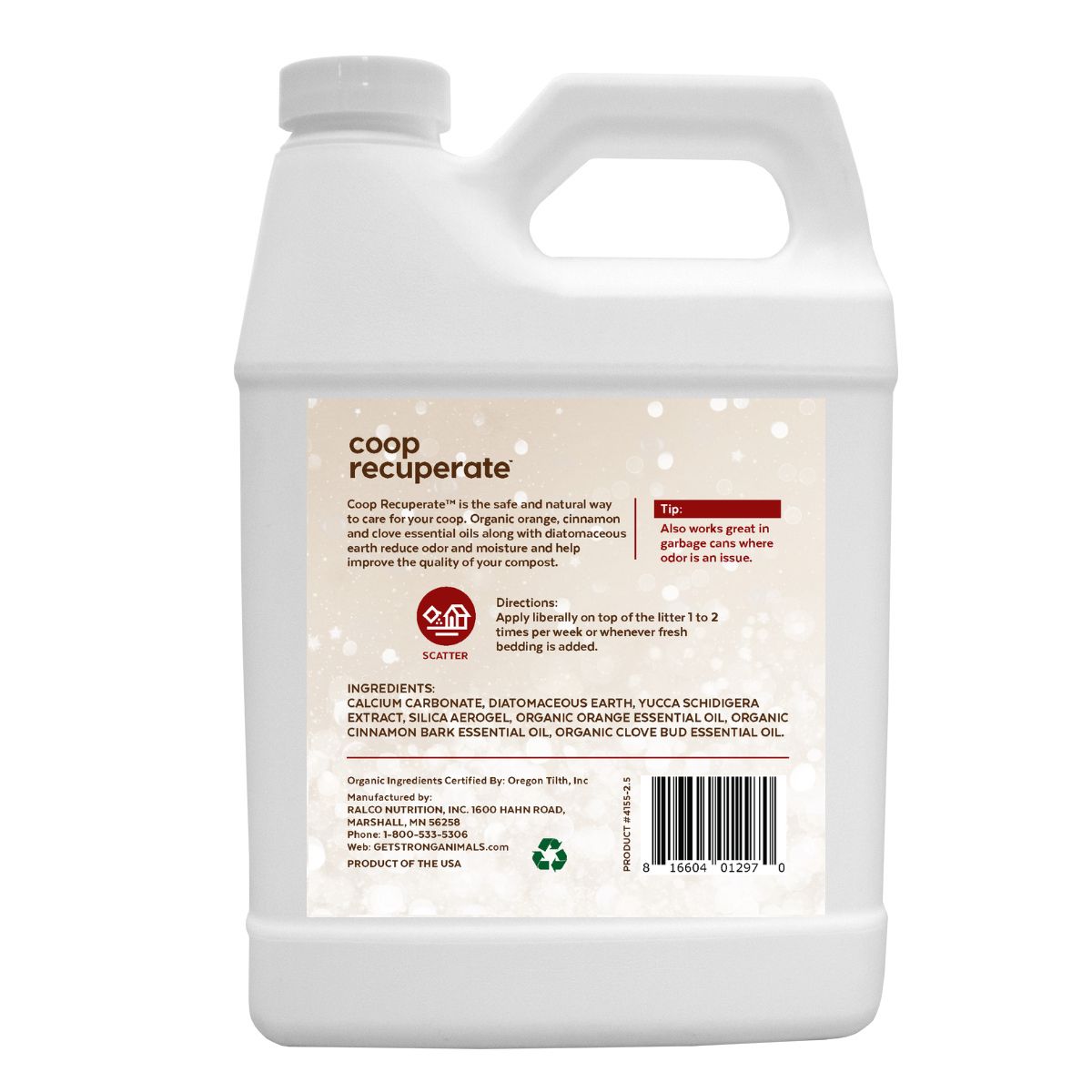 Crafted with the finest orange, cinnamon, and clove essential oils, and diatomaceous earth, Coop Recuperate™ absorbs moisture, diminishes odors, and leaves the chicken coop smelling merry and bright. Scatter in the coop for a smelling comfortable living environment.