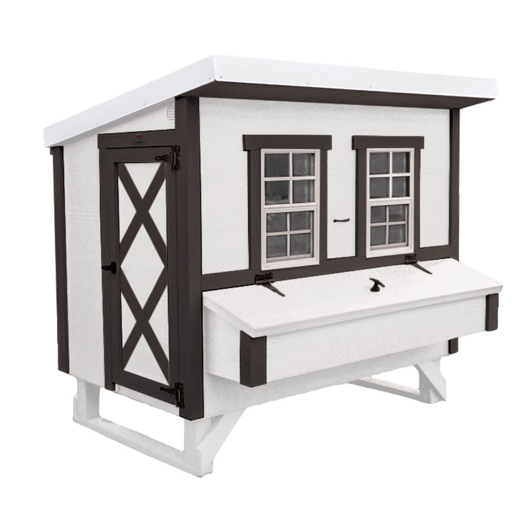 • Flooring & siding has a treated resin. This material is designed for superior moisture resistance and helps with the moisture levels that chickens naturally produce.