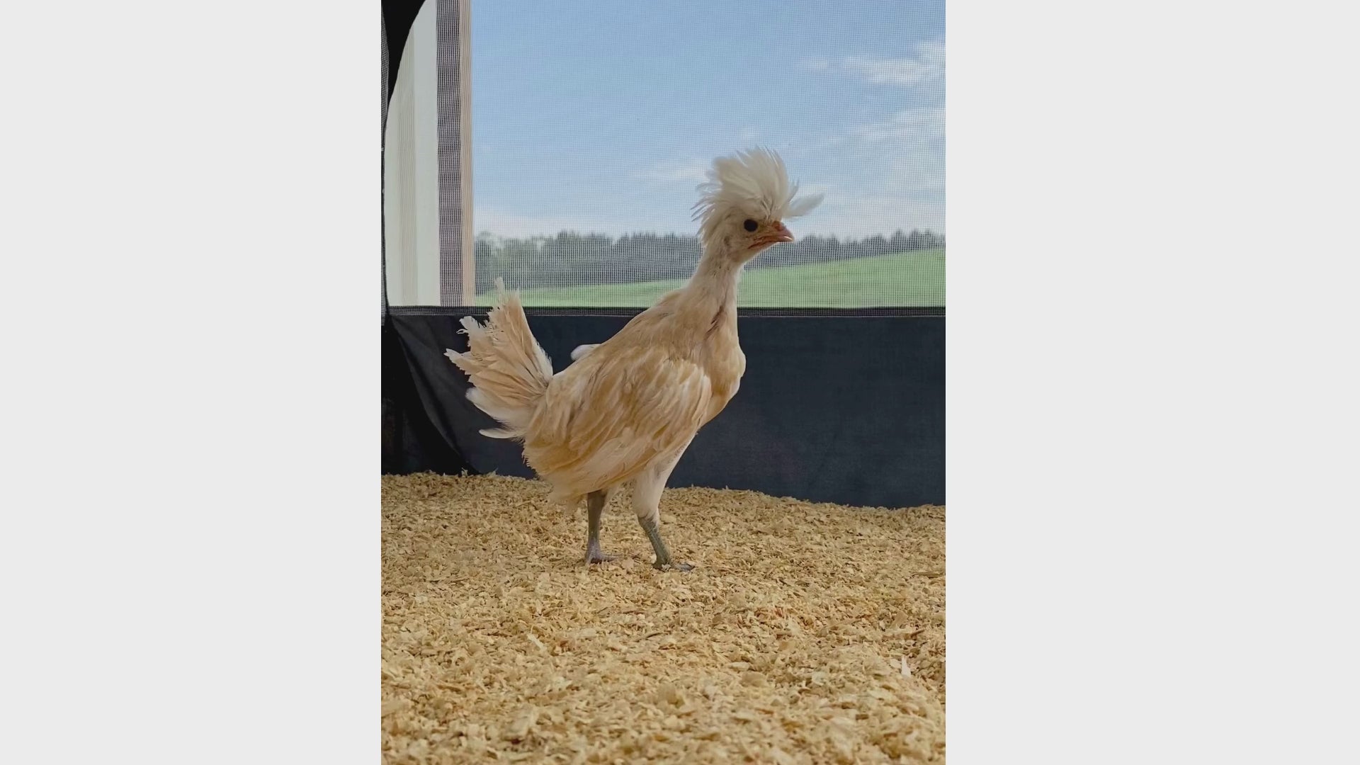 Buff Laced Polish chickens are an exceptional and unique breed of chicken with their huge bouffant crest of feathers and v-shaped comb. They are tame, but their behavior can be a bit wacky since their crest limits their vision. When in a flock with more aggressive breeds, Polish will tend to be on the low end of the pecking order. Egg laying is varied in this breed - some lay well and some very poorly. In short, Polish are sweet, beautiful exhibition birds and can be good layers in the backyard flock, but they're unreliable. Please note that our flocks produce a mix of bearded and non-bearded Polish.