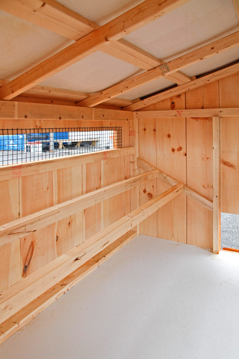 • Your roof will include OLP Tech Shield Roof Sheathing: a thin, durable layer of aluminum laminated to OSB roof sheathing, which creates a highly effective radiant barrier. This radiant barrier helps to block heat from entering the coop and it will keep the coop cooler in warm weather.