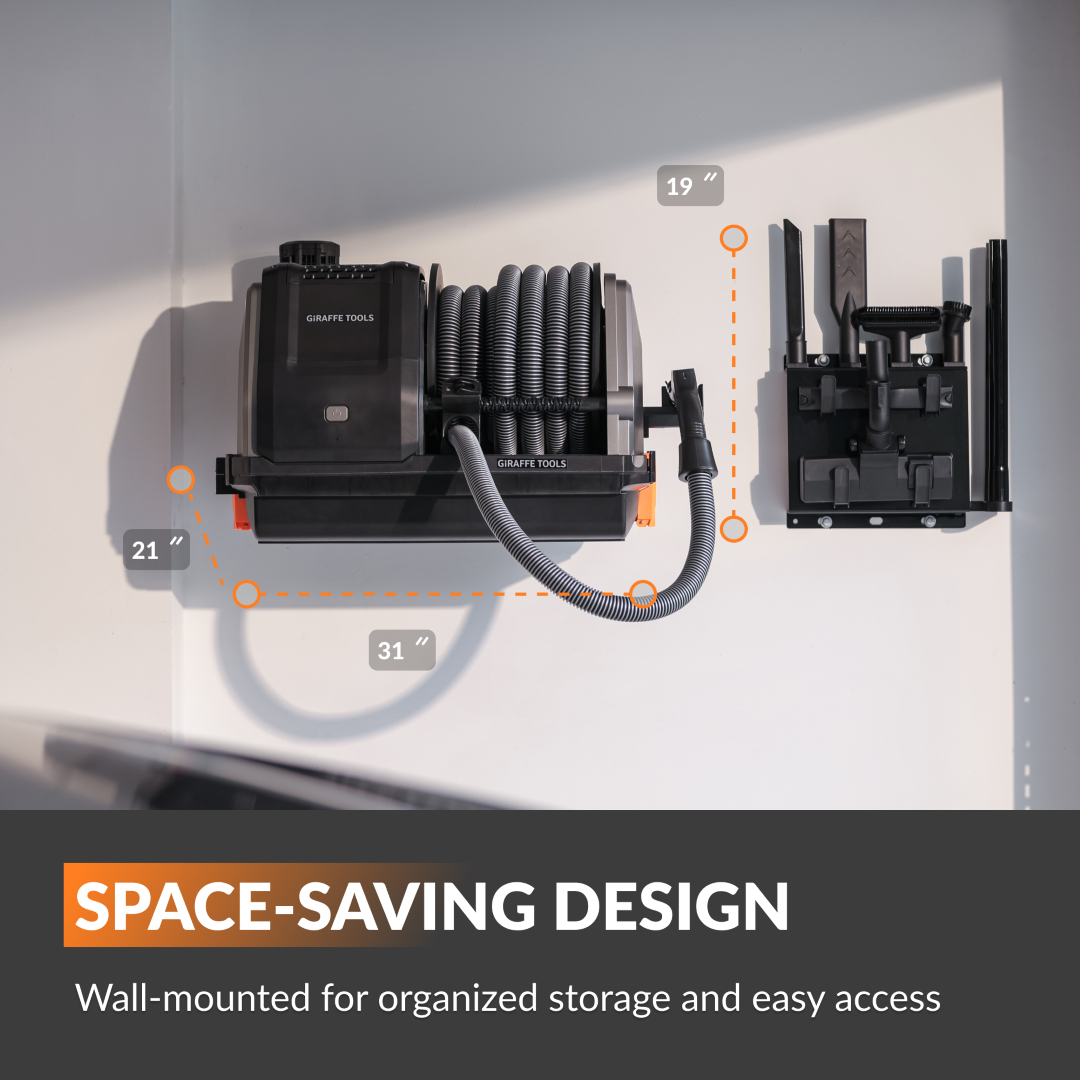 Giraffe Tools' pioneering innovation, combined with a wall-mounted design and #1-rated auto-retract system, redefines the convenience of vacuuming.