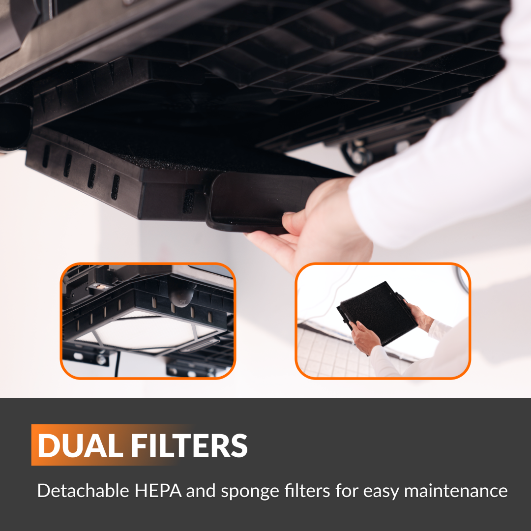 • Large Dustbin, HEPA & Sponge Dual Filters.