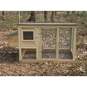 This coop can easily be moved by two strong people to fresh ground. The nest roof opens to collect eggs, and the removable 35" long roost eases the chore of cleaning. This coop can be made tight against rodents and digging predators like foxes by adding a hardware cloth apron around the bottom of the run.